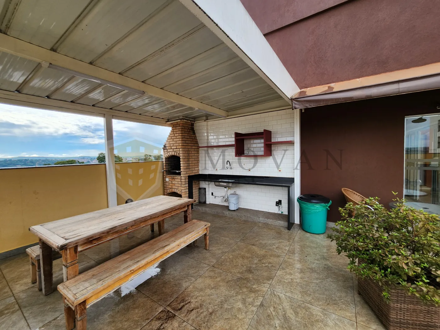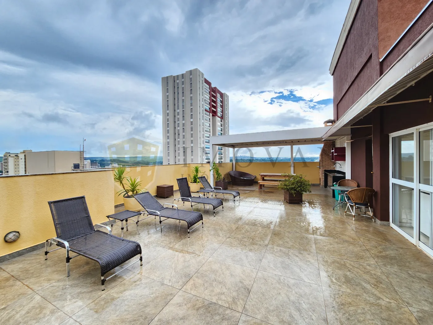 Área de lazer com churrasqueira na cobertura.