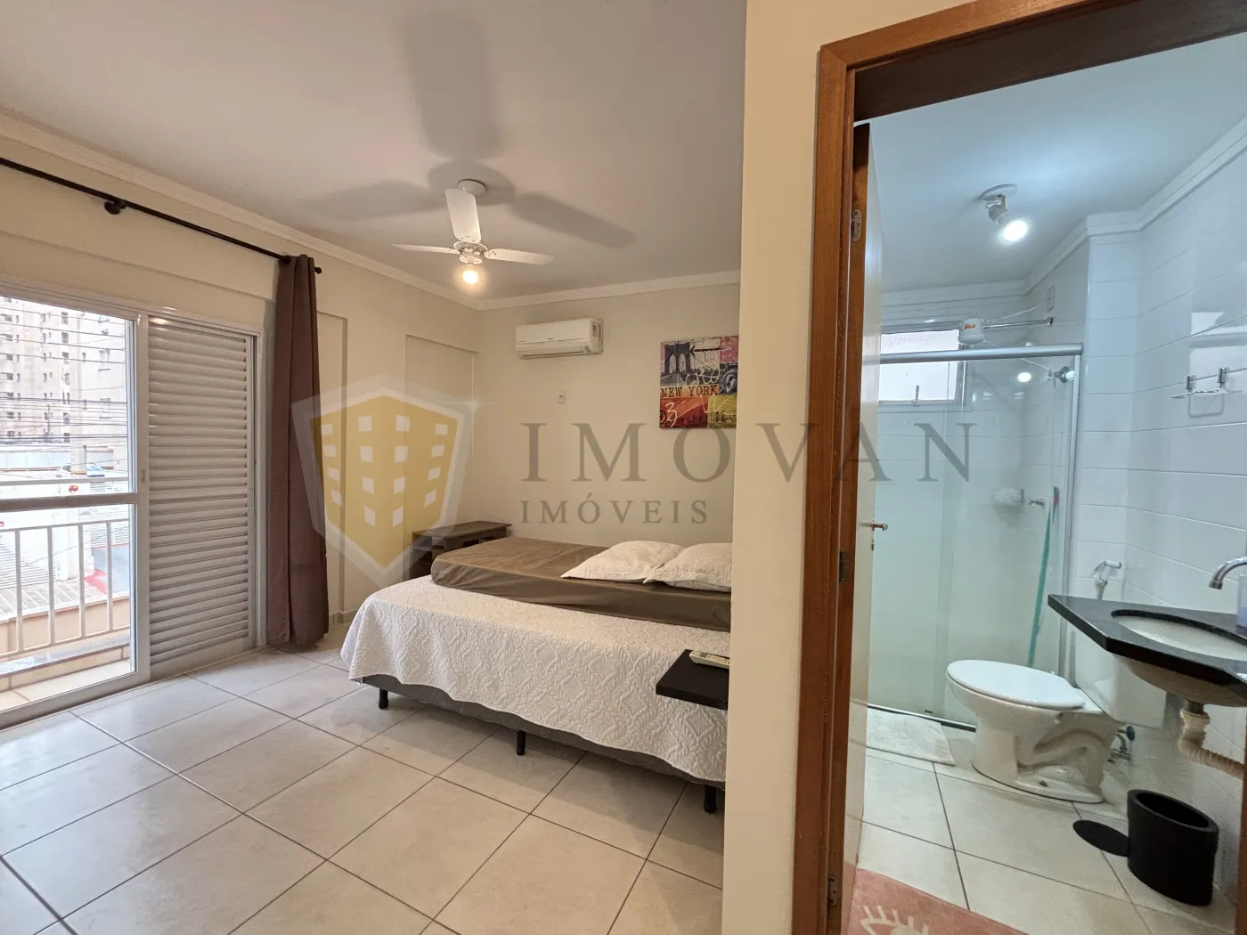 Imóvel rico em armários, equipado com ar-condicionado, iluminação completa, box blindex e ventilador, oferecendo conforto e praticidade para o dia a dia.