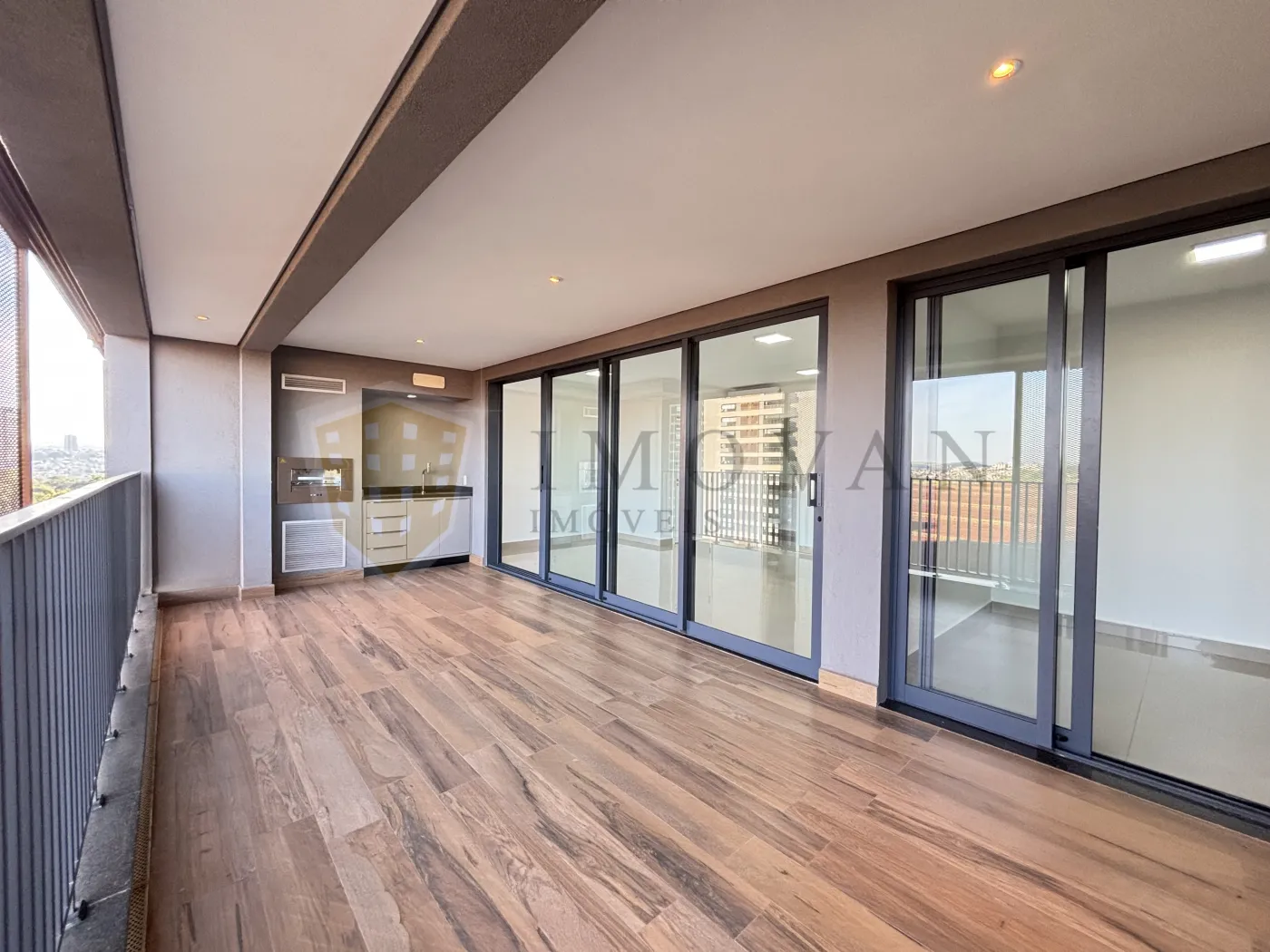 Varanda gourmet com churrasqueira e fechamento em blindex