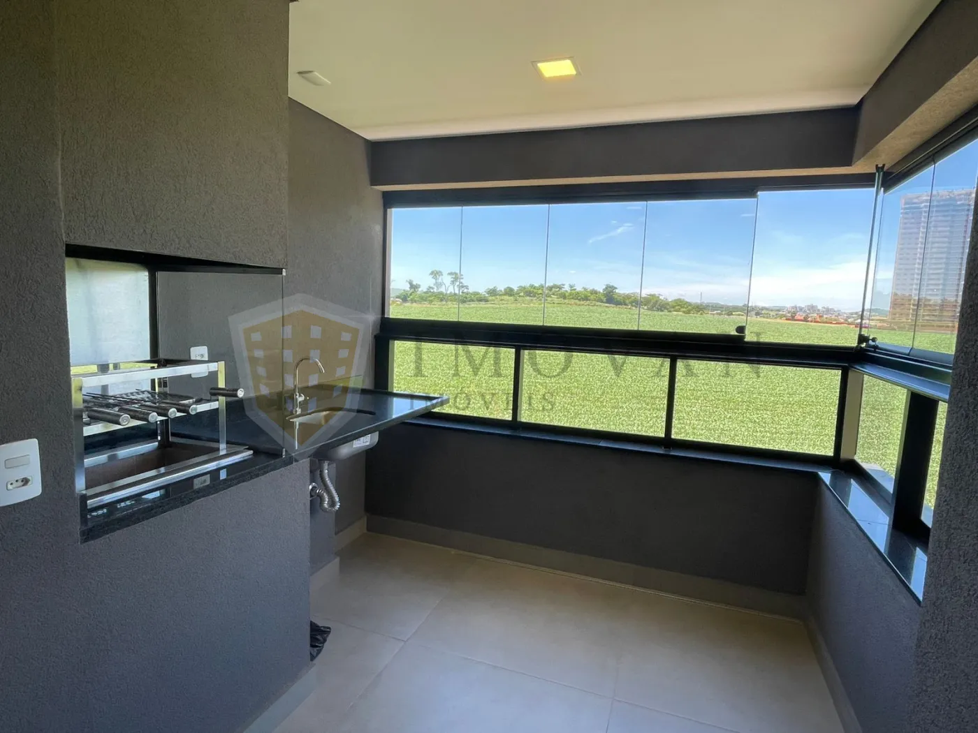 Sacada gourmet fechada com Blindex e churrasqueira