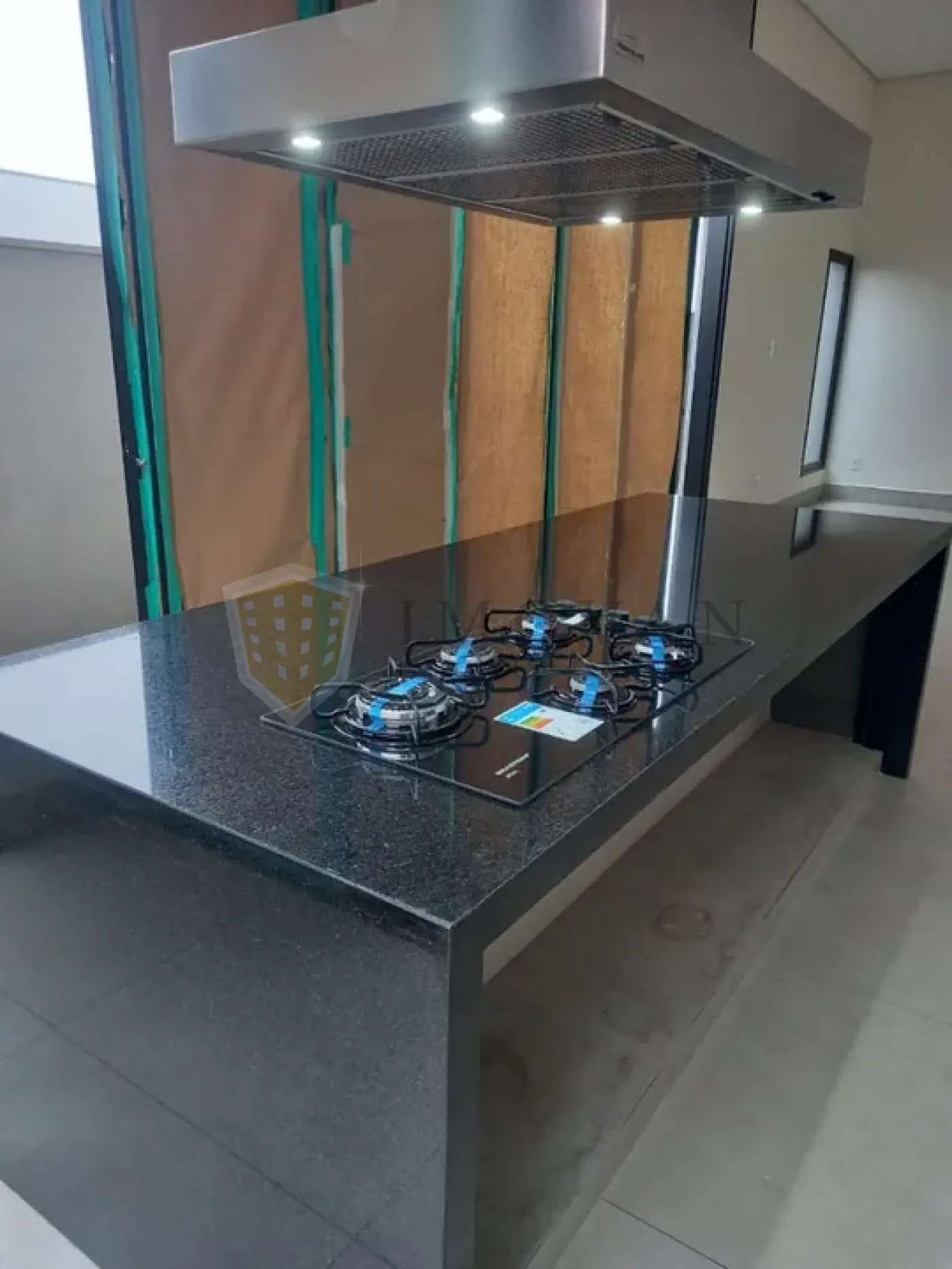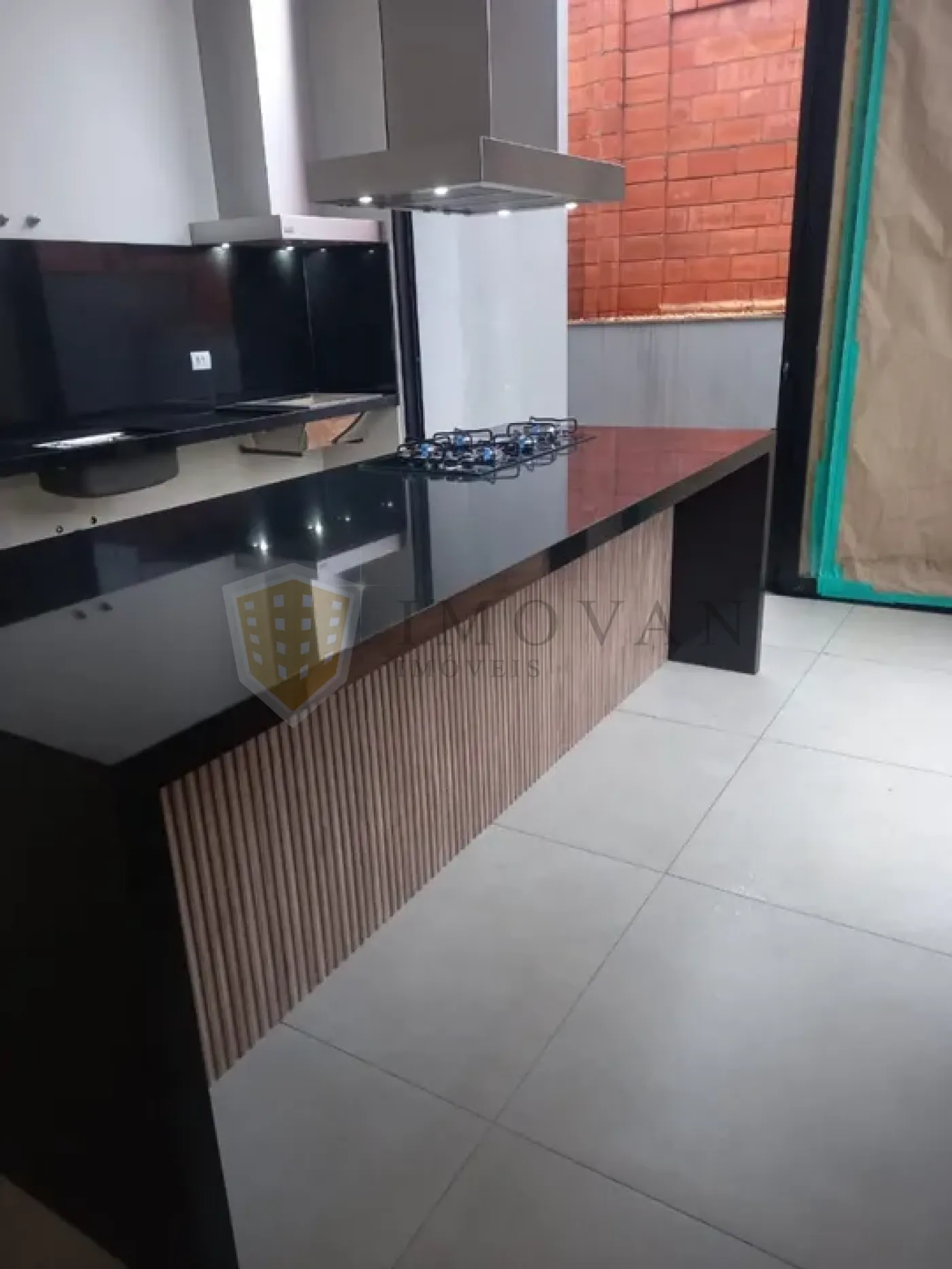 Cozinha gourmet com balcão de 3,00 x 1,10 m, cooktop Brastemp 5 bocas e coifa inox
