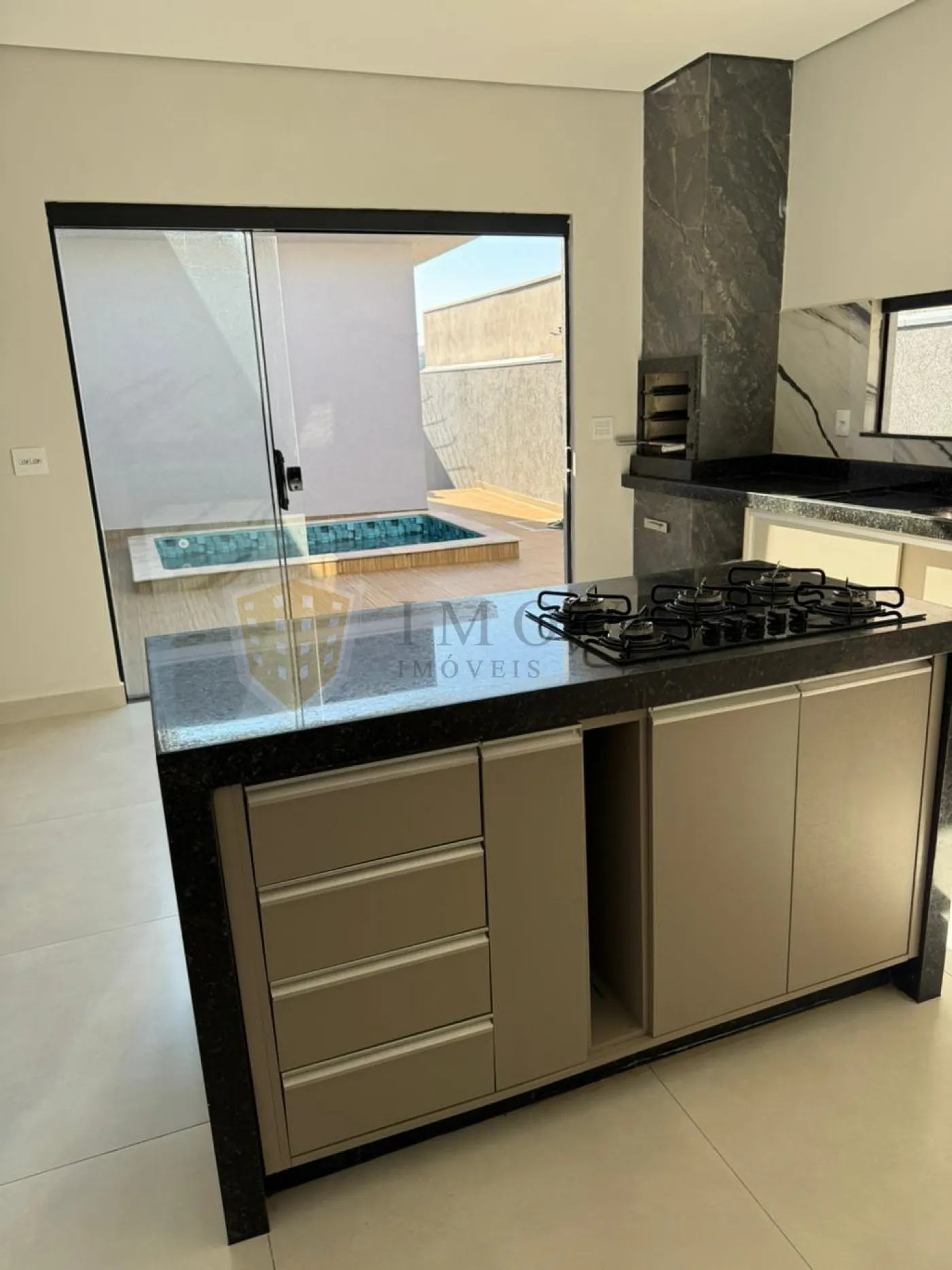 Cozinha gourmet com balcão de 3,00 x 1,10 m, cooktop Brastemp 5 bocas e coifa inox
