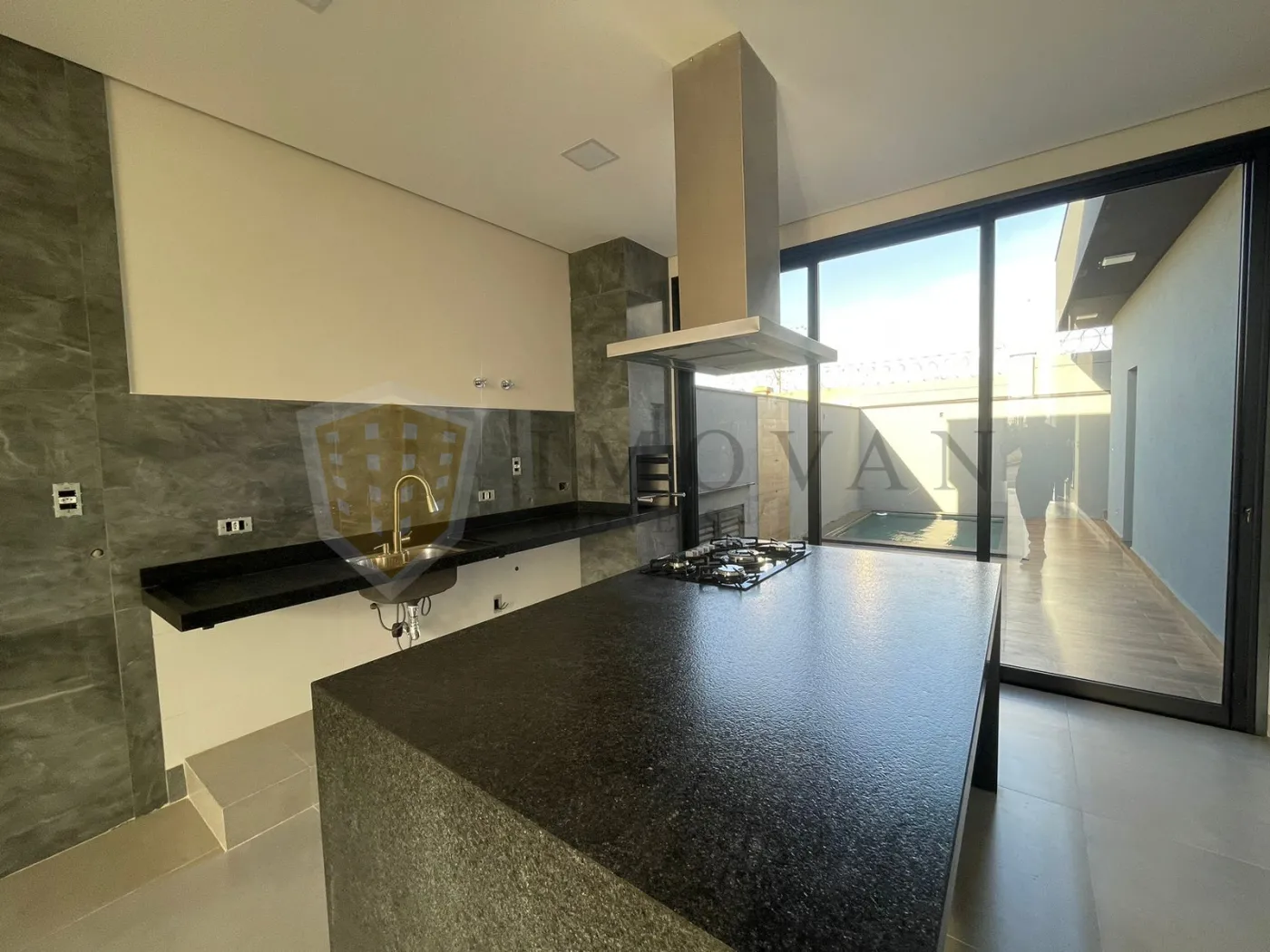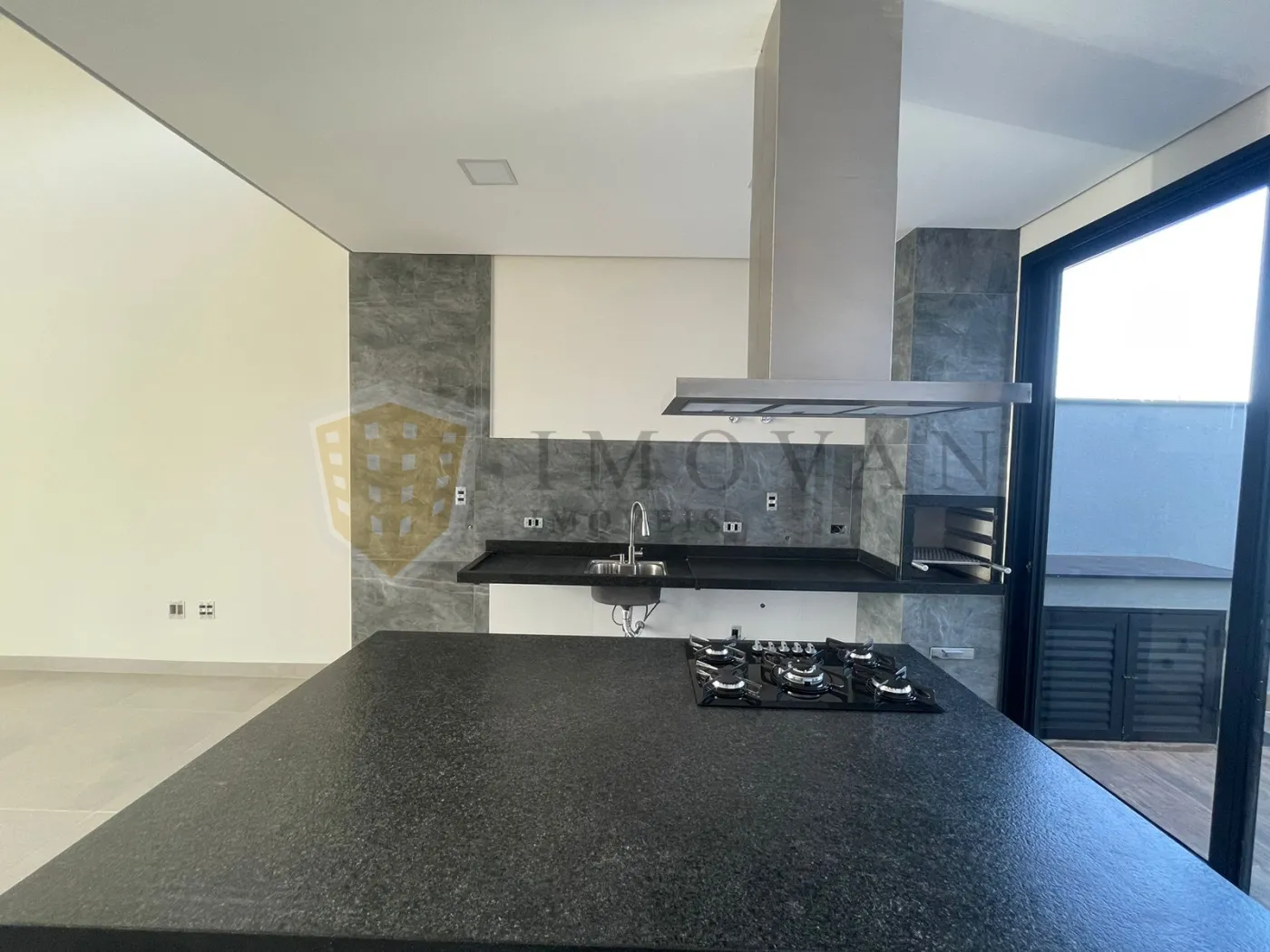 Cozinha gourmet com balcão de 3,00 x 1,10 m, cooktop Brastemp 5 bocas e coifa inox